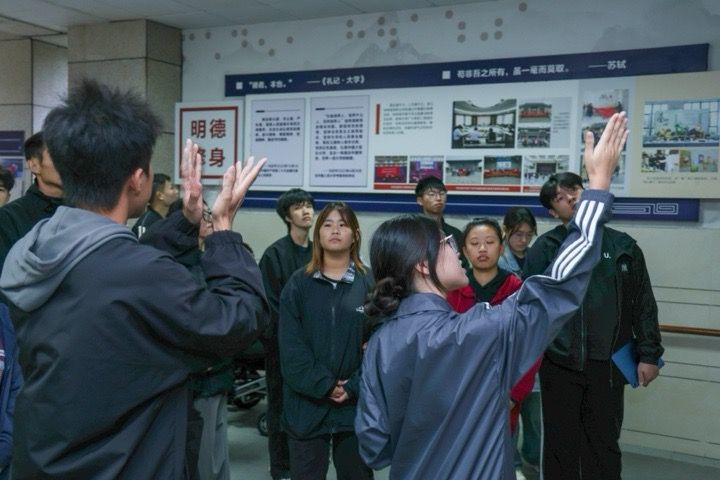 “这是我校校友毛董莱,作为一名先天性重度听障人士,她通过助听器和读唇语攻克语言障碍,成长为专业手语主持人,她在2010年组建的"手语姐姐"团队已发展成规范化助残组织……” 在 “政通业兴” 展区,手语讲解员小马一边打手语,一边用语音讲解着展墙上的校友事迹。作为 “清心廉行”手语讲解成员,他和另外20名讲解员经过一个多学期的系统培训,已能独立完成各类群体的讲解服务。活动现场,新生们在讲解员带领下上完 “清廉第一课”。“看到学长学姐用专业能力传递廉洁力量,我也想加入讲解团队。” 听障新生小李通过手语翻译表达心声,她刚在“清心廉行”讲解员报名表上签下自己的名字。