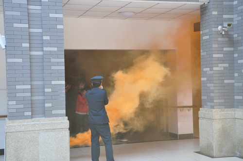 下午15:10,疏散演练正式开始。教学楼多处冒出橙色烟雾,校广播紧急发布火警通知。在安全员指挥下,师生们用湿毛巾捂住口鼻,弯着腰,迅速从教学楼、行政楼等处疏散到篮球场安全区,各班及时清点人数,上报演练领导小组。校医务人员、校车队在现场随时待命。整个疏散演练过程持续了6分钟。疏散演练结束,我校还进行了灭火演练。