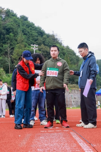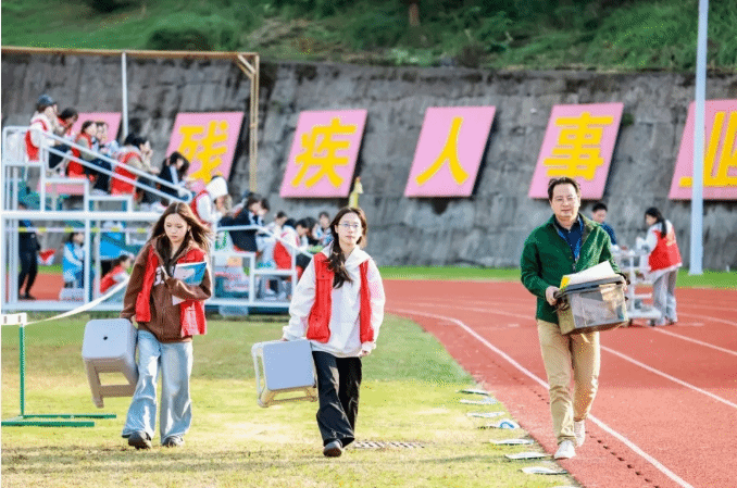 140余名裁判严谨执裁,209名学生志愿者穿梭服务:是视障选手的“眼睛”,听障选手的“传声筒”,更是物资补给的“搬运工”,致敬运动会上最暖“志愿红”。