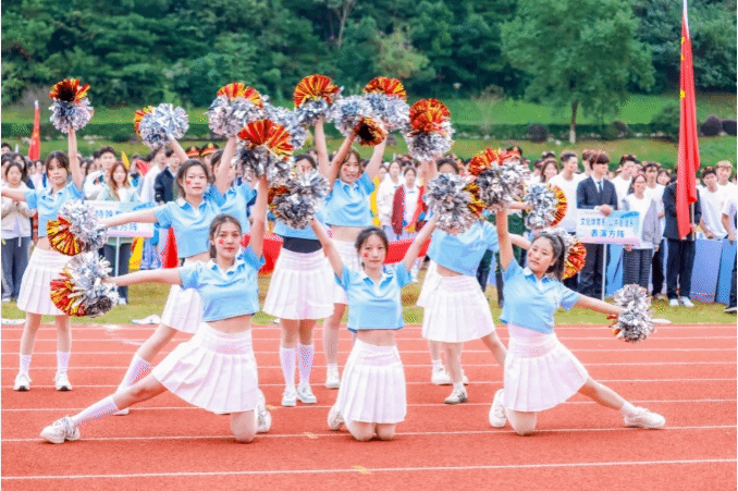 特殊教育系表演方阵在红歌旋律中,学生身姿轻盈灵动,似追光的蝶。他们每一步都踩着信念的鼓点,红歌与舞步交织,绘就赛场最暖的风景。康复技术系表演方阵,舞龙惊艳亮相,龙身翻腾如活。红色跑道上,盲生射手们蒙眼持枪,每一个姿态都是突破黑暗的勋章,尽显青春与力量。文化体育系方阵惊艳登场,啦啦操舞动青春,彩球翻飞,笑靥如花,跳跃间尽显蓬勃张力,将赛场的青春朝气推向高潮。