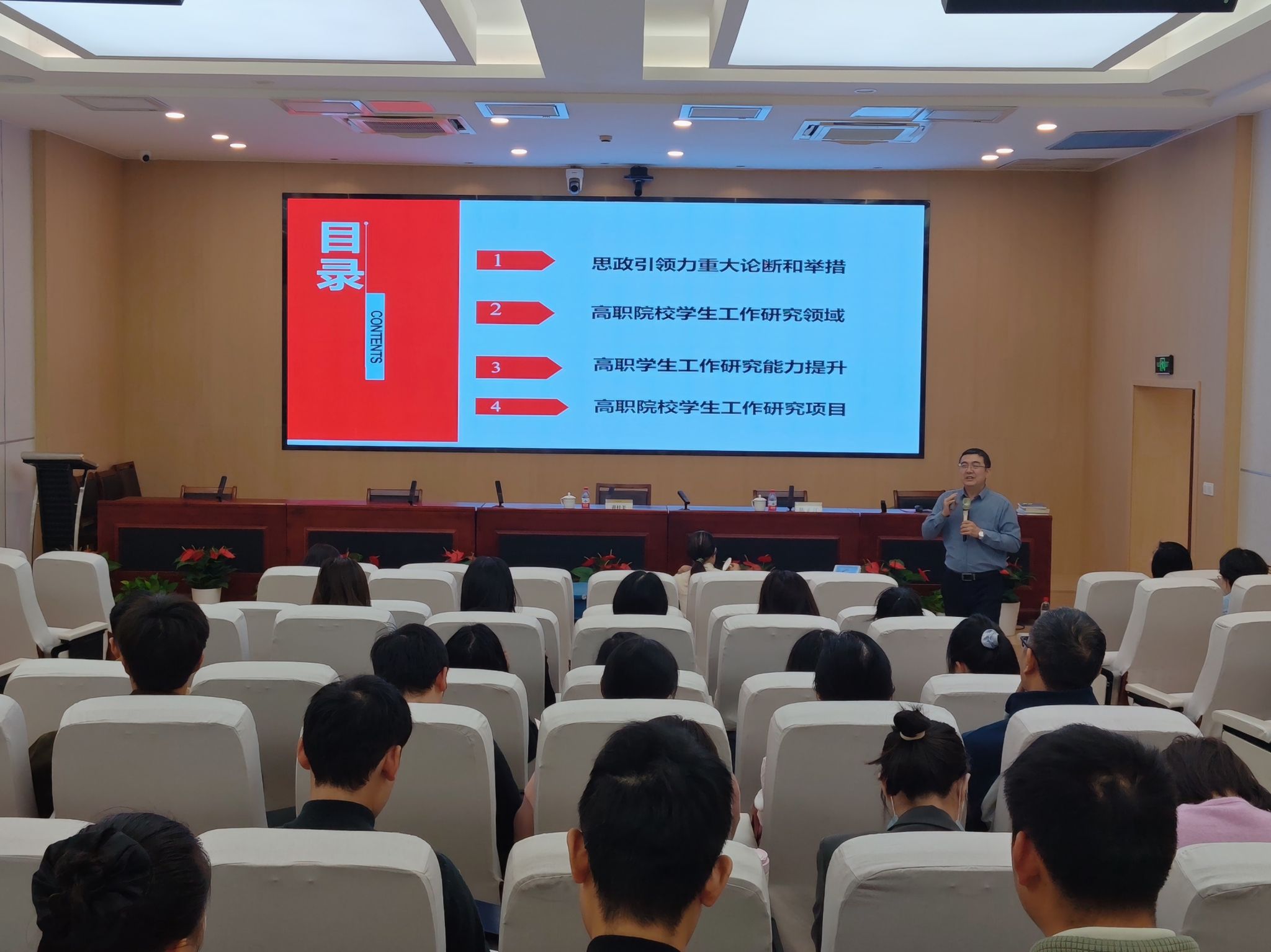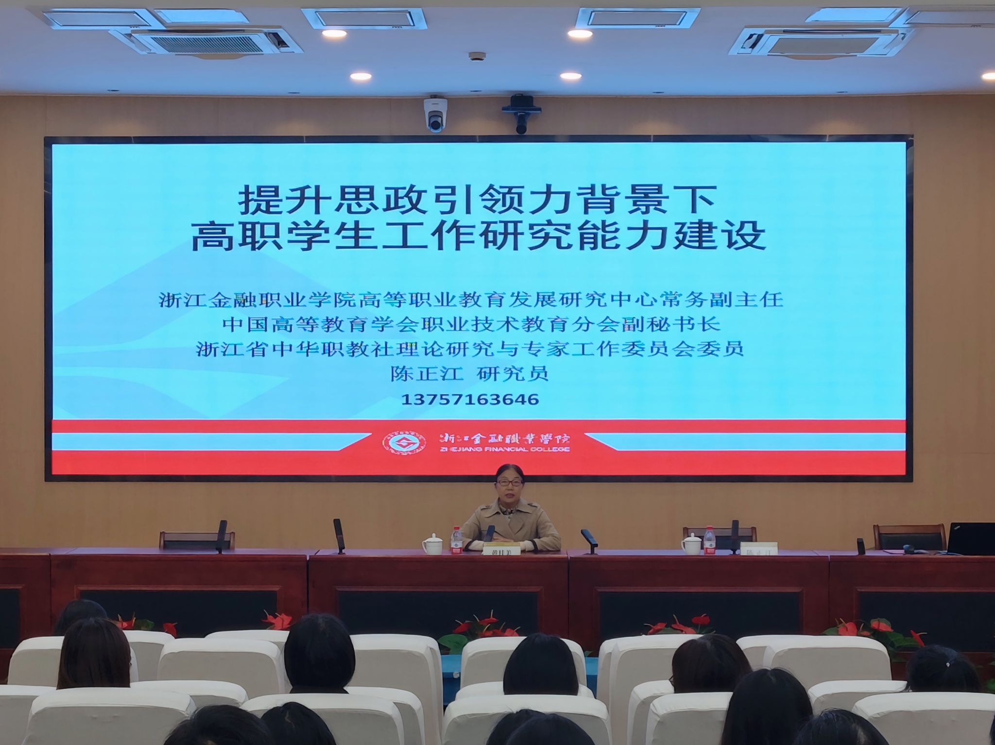 10月29日,浙江金融职业学院高等职业教育发展研究中心常务副主任、中国高等教育学会职业技术教育分会副秘书长陈正江研究员以“提升思政引领力背景下高职学生工作的研究能力”为主题主讲浙特学工·博爱讲堂第三十一期,为全面提升我校学生工作队伍的理论研究能力,备战申报高层次辅导员工作室、班主任工作坊、高校思想政治工作质量提升综合改革与精品建设项目、学生工作教科研课题提供有力支撑。讲座由副院长黄桂美主持,我校班主任、辅导员100余人参加讲座。