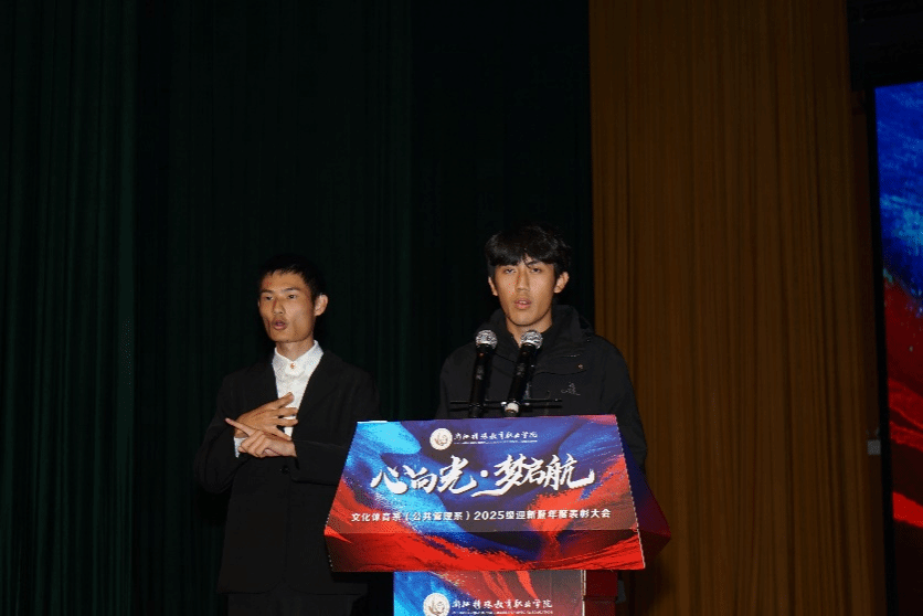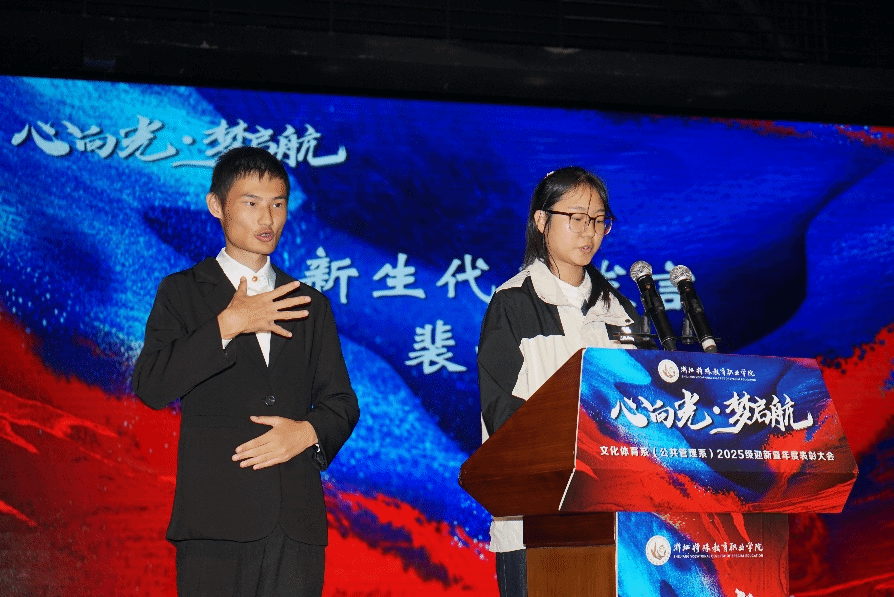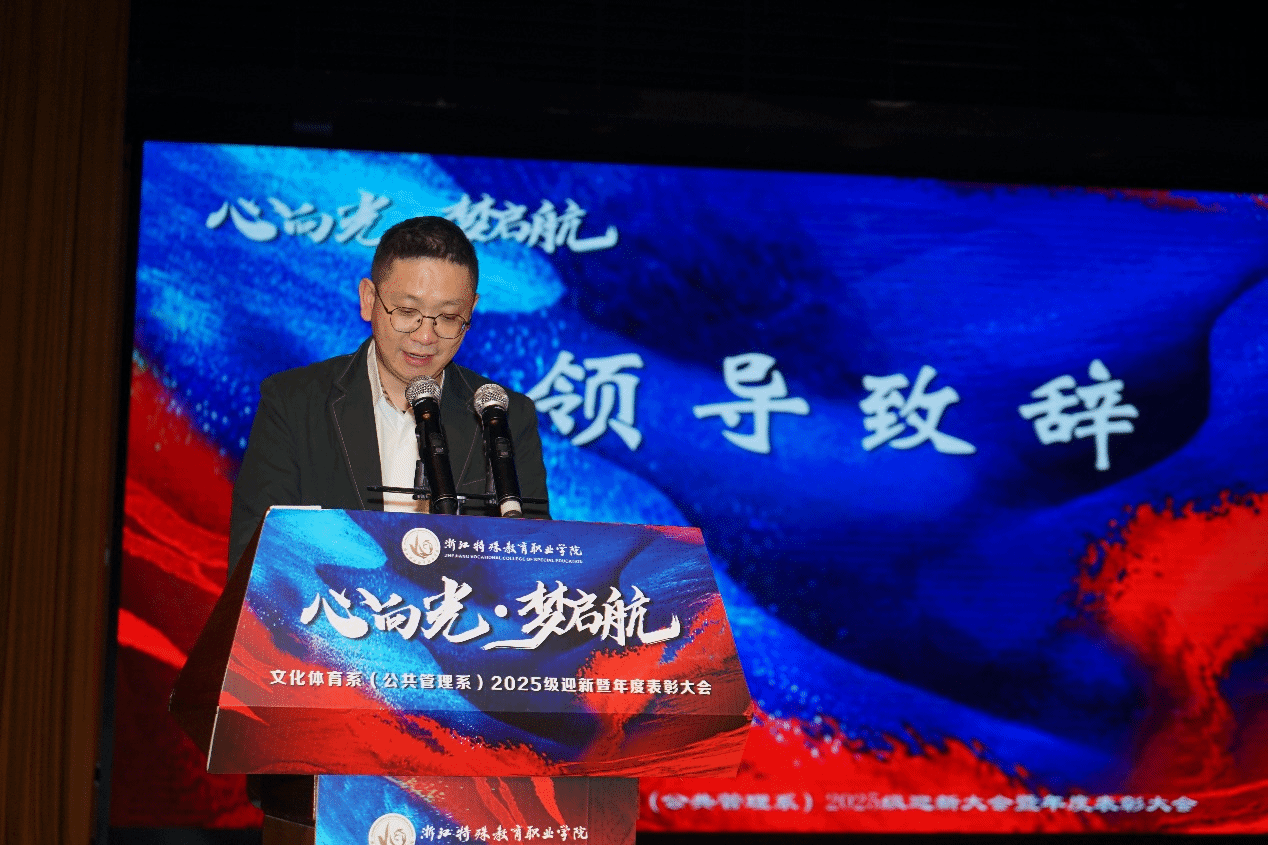 大会伊始,文化体育系(公共管理系)主任张磊老师为新生致辞:“愿你们以特殊教育为舟,以技能报国为帆,在浙特教院书写属于自己的精彩篇章。”
