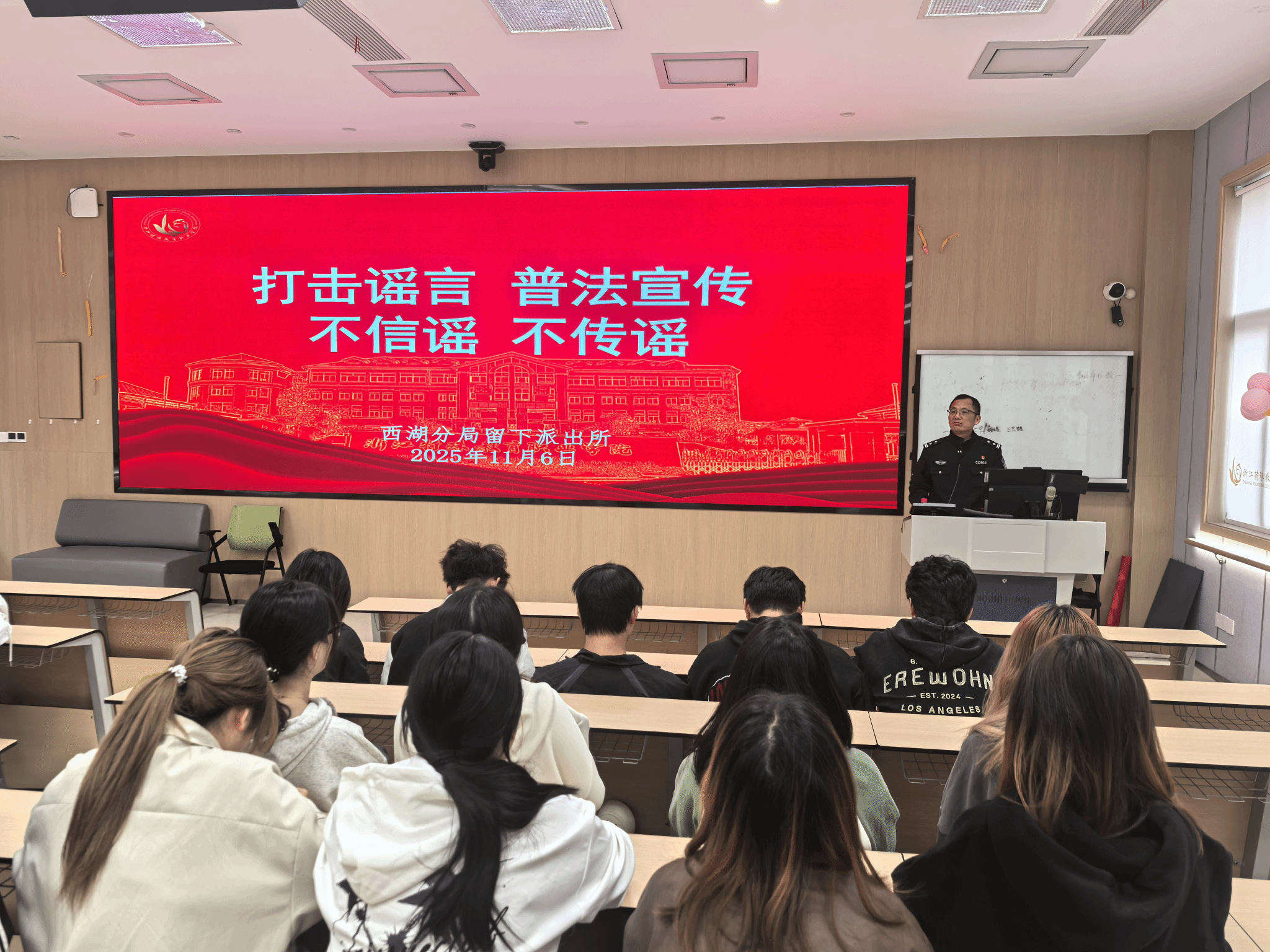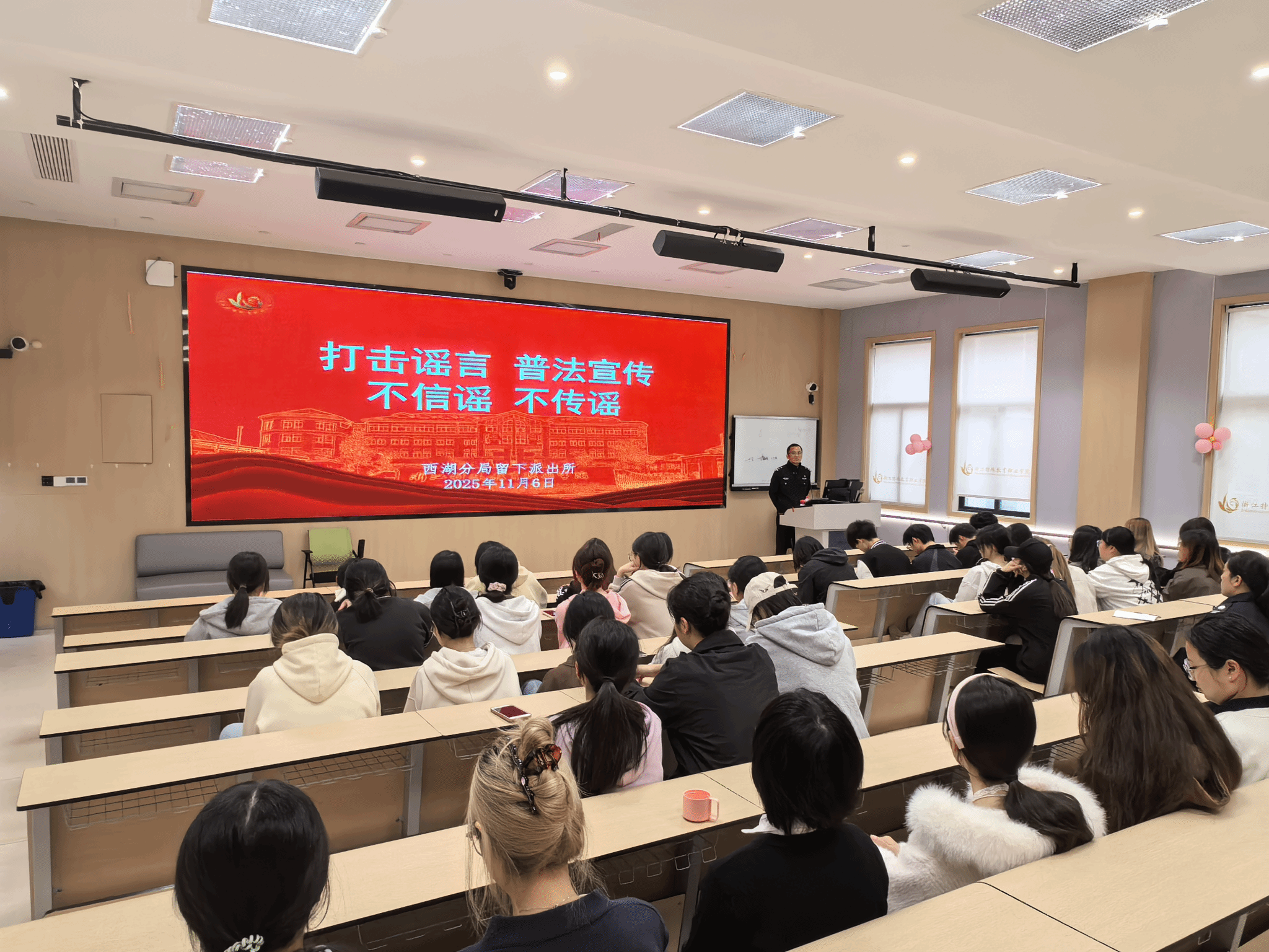 11月6日,浙江特殊教育职业学院联合留下派出所开展打击网络谣言主题培训。民警用通俗易懂的语言围绕网络谣言的定义、常见类型、传播规律及社会危害展开讲解,通过典型案例剖析与法律条款解读相结合的方式,深入拆解编造、传播网络谣言的违法后果,明确强调网络空间不是法外之地,提醒大家在转发信息前务必核实来源,严守法律和道德底线。