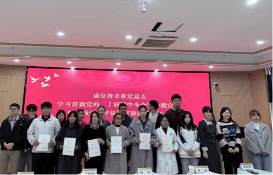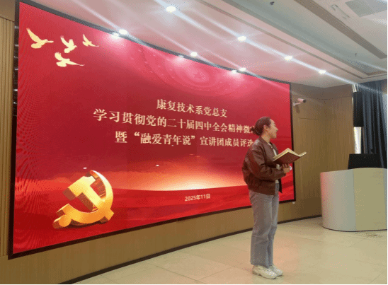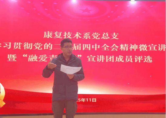 为深入学习贯彻党的二十届四中全会精神,推动全会精神在青年学生群体中入脑入心,11月27日,康复技术系党总支举办党的二十届四中全会精神微宣讲暨“融爱青年说”宣讲团成员评选活动。康复技术系党总支书记陆统、组织部副部长王珏瑜,康复技术系师生党员以及入党积极分子参加本次活动。