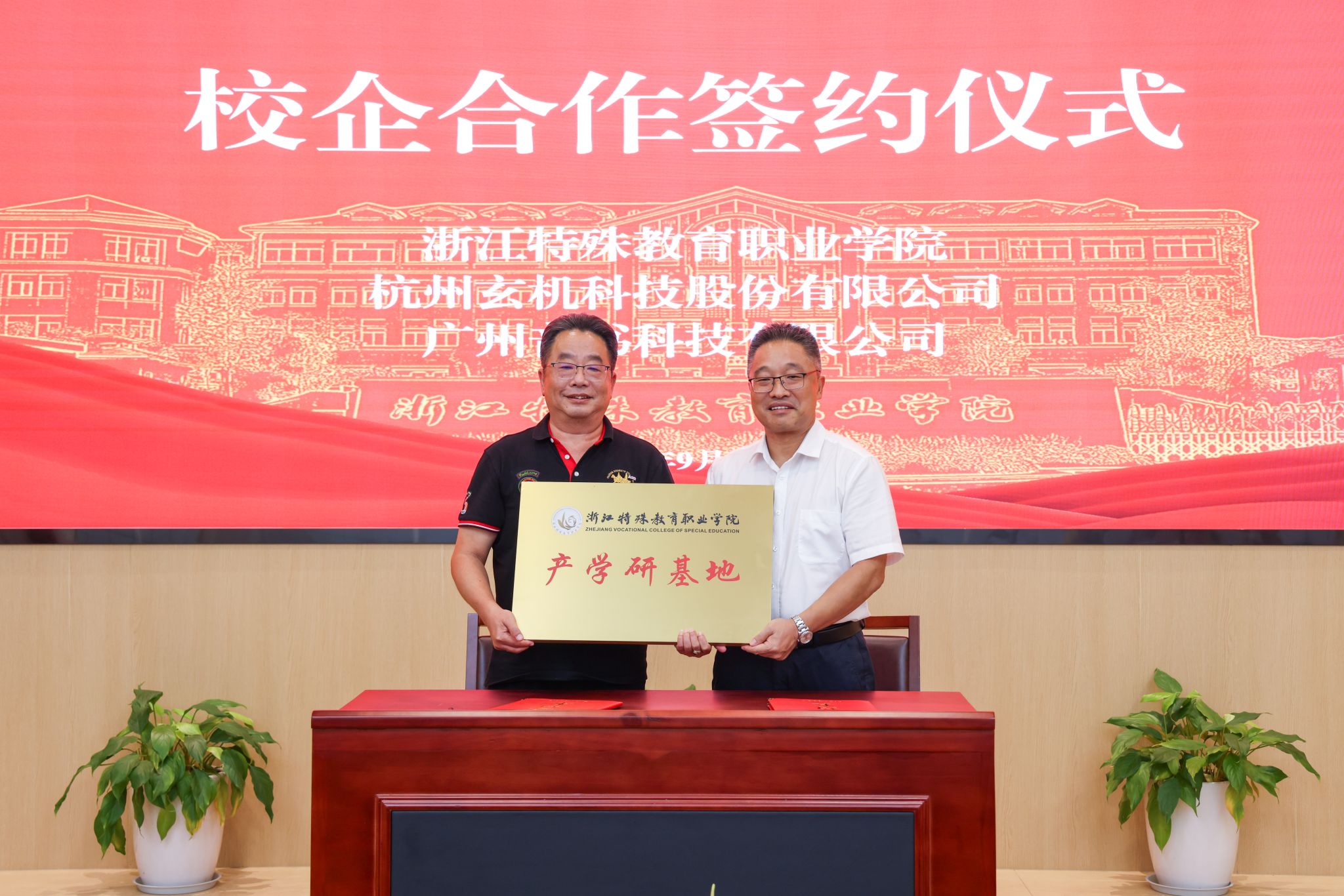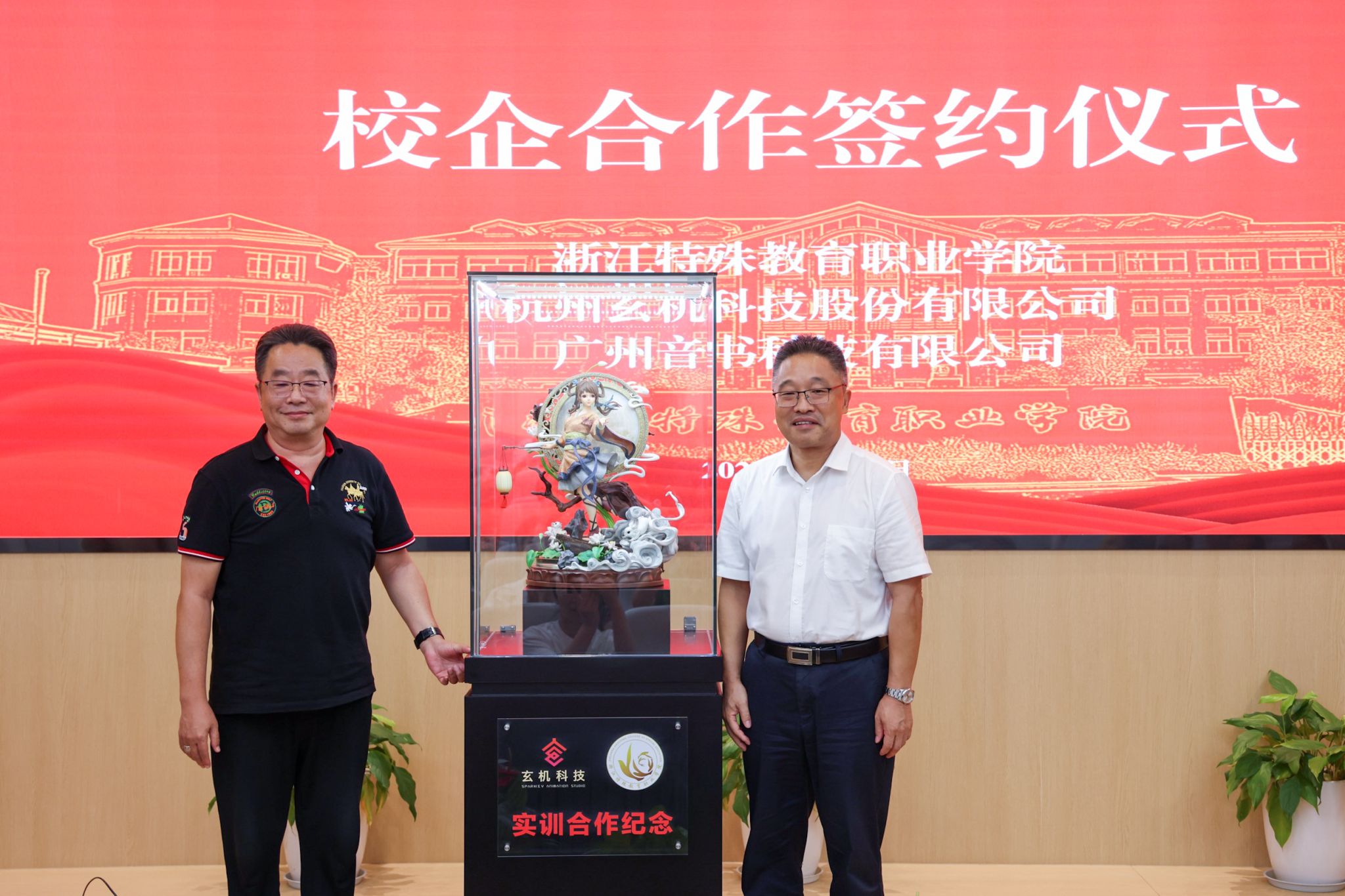 仪式现场,黄宏伟与葛之强共同签署合作协议。玄机科技被授予“浙江特殊教育职业学院产学研基地”牌匾,并捐赠动漫IP雕像作为校企合作的象征与激励。